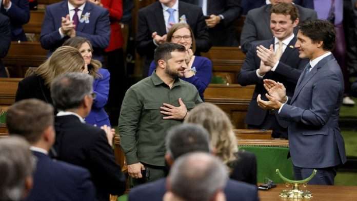 Udhëheqësi ukrainas mbajti fjalimin e tij duke falënderuar kryeministrin dhe qeverinë kanadeze për duartrokitje të rrëmbyeshme dhe ovacione të vazhdueshme.