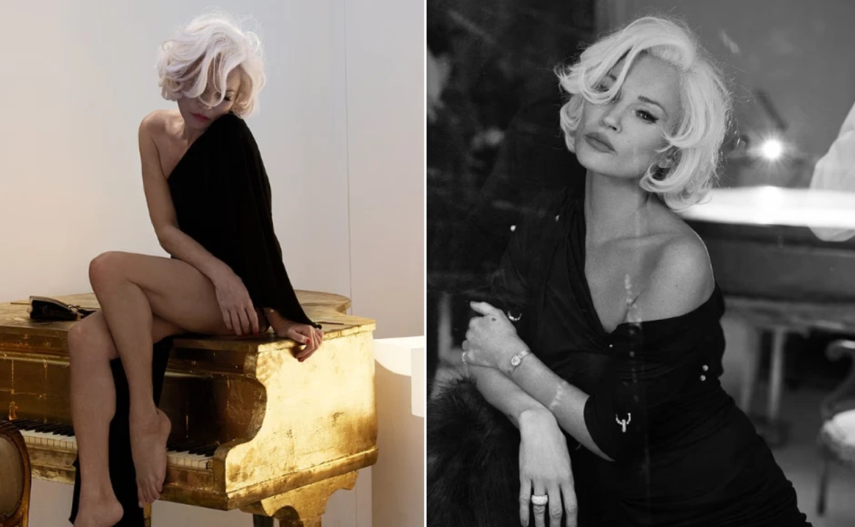 Në imazhet artistike, Moss shfaqet herë me një fustan elegant të zi mbi një piano të artë, e herë me një dukje më minimaliste dhe sensuale, duke ruajtur sharmin që e ka bërë të famshme ndër vite.