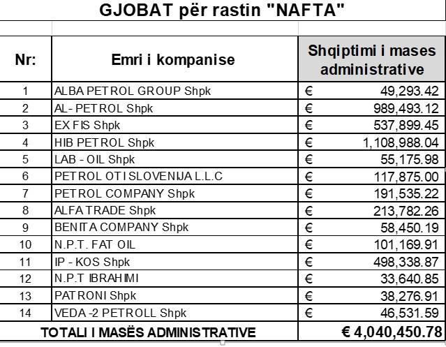 Kompanitë që janë gjobitur janë ALBA PETROL GROUP, AL-PETROL, EX FIS, HIB PETROL, LAB-OIL, PETROL OTI SLOVENIJA L.L.C, PETROL COMPANU, ALFA TRADE, BENITA COMPANY, N.P.T FAT OIL, IP-KOS, N.P.T. IBRAHIMI, PATRONI, VEDA-2 PETRO.