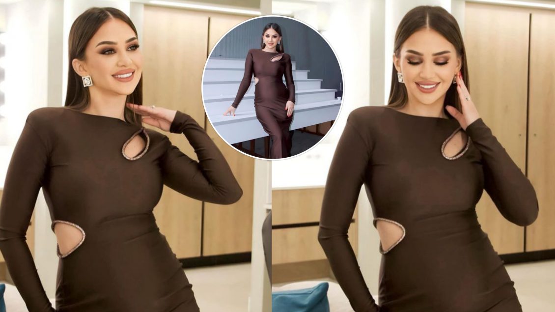 E veshur me një fustan të gjatë ngjyrë kafe, të cilën e koordinoi edhe me makijazh të theksuar dhe aksesor, moderatorja dukej tërë shkëlqimi.