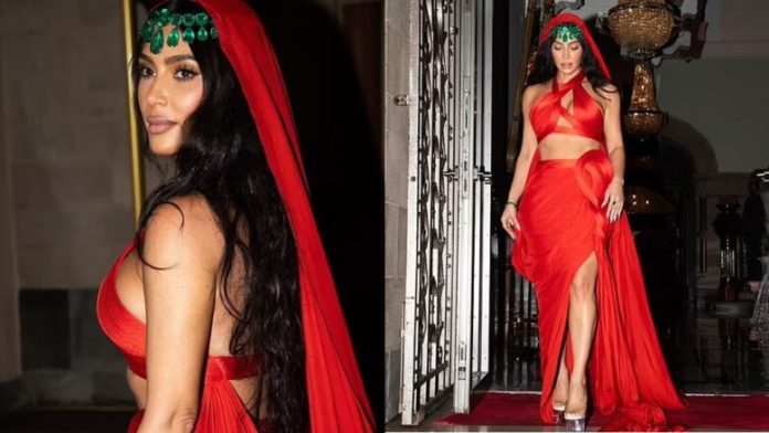 Pasi mbërriti me një veshje tradicionale për ceremoninë e dasmës, Kim, e cila shoqërohej nga motra e vogël Khloe, krijoi imazhe të Princeshës Jasmine të Aladdin me një fustan të kuq mahnitës dhe pelerine të ngjashme, shkruan DailyMail.