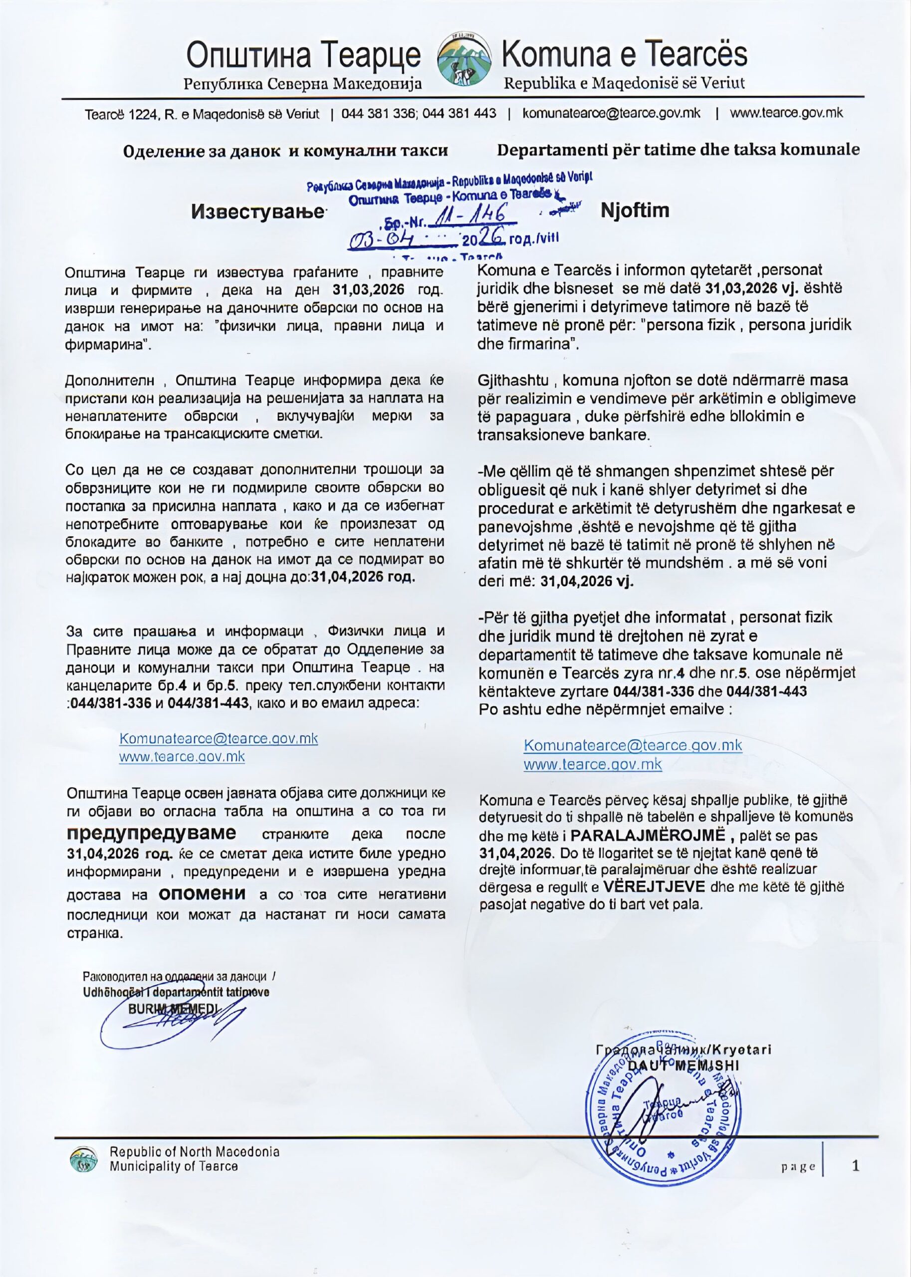 Nga Komuna e Tearcës apelojnë që obligimet të paguhen brenda afateve të parapara, duke theksuar rëndësinë e përgjegjësisë fiskale.