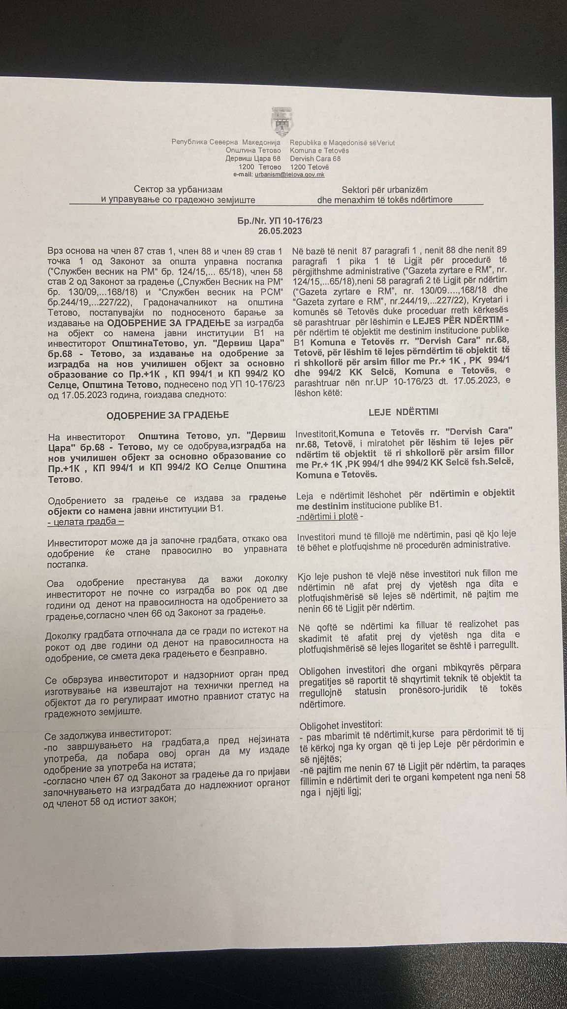 Informojmë qytetarët se Leja e Ndërtimit me nr. 10-176/23, e datës 26.05.2023, është lëshuar nga Kryetari aktual i Komunës së Tetovës, z. Bilall Kasami. Punimet ndërtimore kanë filluar vetëm pas dhënies së kësaj leje dhe zhvillohen konform të gjitha standardeve dhe dispozitave ligjore në fuqi.