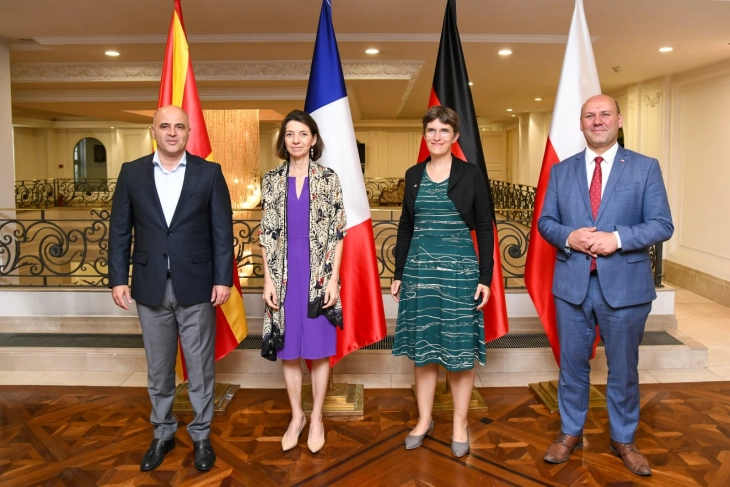 Mbështetje e qartë dhe e fuqishme e Republikës së Maqedonisë së Veriut për vazhdimin e negociatave me BE-në dhe integrimin e përshpejtuar evropian, është shprehur në takimin e kryeministrit Dimitar Kovaçevski me përfaqësuesit e lartë të Treshes së Vajmarit, Lorans Bun, ministre shtetërore përgjegjëse për Evropën në Këshillin e ministrave të Republikës së Francës, Ana Lirman, ministre për Evropën dhe klimën e Republikës Federale të Gjermanisë dhe ministrin për Bashkimin Evropian të Republikës së Polonisë, Shimon Shinkovski vel Senk, të cilët janë për vizitë zyrtare dyditore në Shkup.