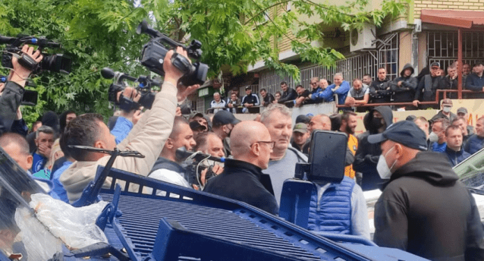 Kur ndaloi pranë mjetit të njësisë speciale, protestuesit hodhën shishe boshe në drejtim të Rakiç.