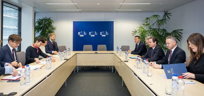 Kryeministri i Kosovës, Albin Kurti, në Bruksel u mirëprit nga Komisionerja e Bashkimit Evropian për Zgjerim, Marta Kos.