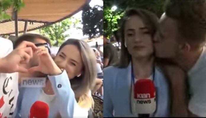Gazetarja e mori me humor episodin, aq sa tifozi i kërkoi të formojnë edhe një zemër me duar dhe u largua vetëm pasi i dha edhe një puthje tjetër gazetares.