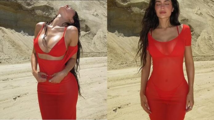 E dashura e Timothee Chalamet kishte veshur bikini të kuqe me një fustan të ngjashëm, teksa qëndronte në një plazh me flokët e zinj poshtë.