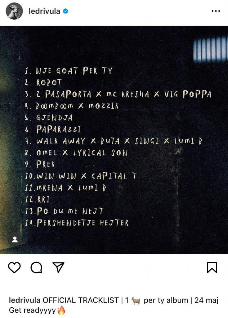 Ledri përmes një postimi në Instagram ka treguar listën zyrtare të këngëve të albumit që po e sjell, përcjell Klankosova.tv.