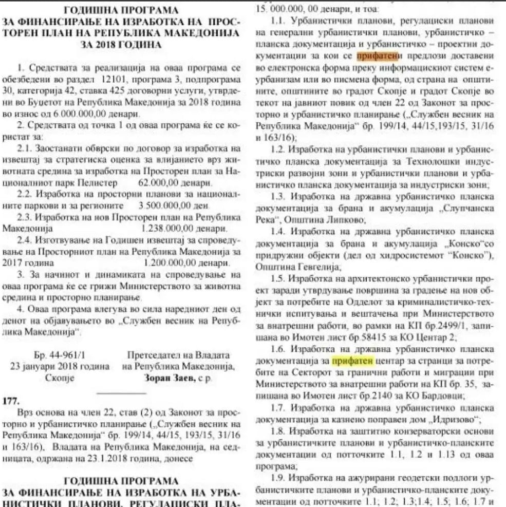 – Konkretisht, në “Gazetën Zyrtare të Republikës së Maqedonisë”, më 26.01.2018, numri 16, faqja 189, pika 1.6, thuhet, citoj: “Zhvillimi i dokumentacionit shtetëror të planifikimit urban për një qendër pritjeje për të huaj për nevojat e Sektorit për Çështje Kufitare dhe Migracion në Ministrinë e Brendshme në KP Nr. 35, i regjistruar në Listën e Pronës Nr. 2140 për Komunën e Bardovcit.”