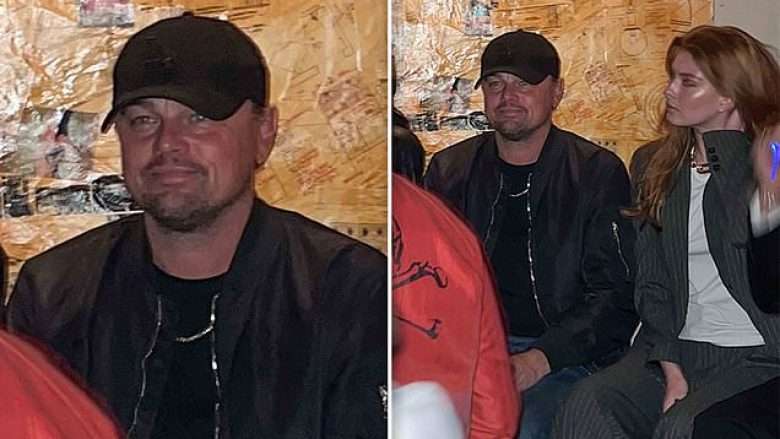 Gruaja e ulur në të majtë të DiCaprios dukej elegante me një kostum gri me vija, të cilin e veshi me një bluzë të thjeshtë të bardhë.