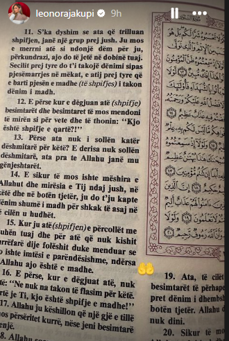 Leonora postoi një fotografi duke lexuar librin e shenjët Kuranin.