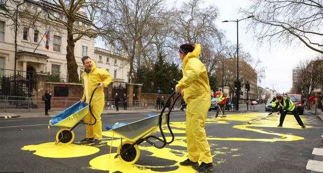 Katër persona janë arrestuar pasi protestuesit lyen rrugën jashtë ambasadës ruse në Londër me ngjyrat e flamurit ukrainas, shkruan BBC, transmeton Klan Kosova.