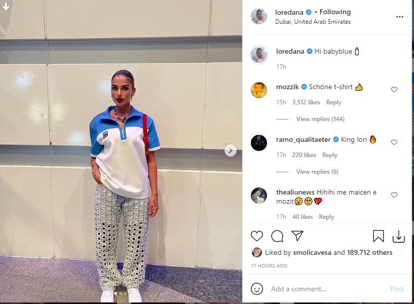 Loredana ka shkruar në këtë postim: “Përshëndetje babyblue”, teksa mund të aludohet se i referohet dëshirës së saj që shtatzënia e dytë të jetë djalë pasi ngjyra e kaltër sipas stereotipave simbolizon fëmijën djalë.