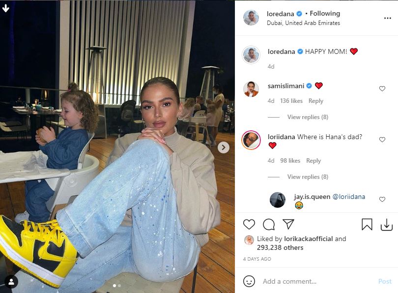 Një fotografi e saj, e cila ka publikuar shihet në një restorant bashkë me vajzën Hanën dhe shohim se e mbulon barkun me këmbën e saj dhe në mbishkrimin e postimit ka shkruar: “Nënë e lumtur” në gjuhën angleze.