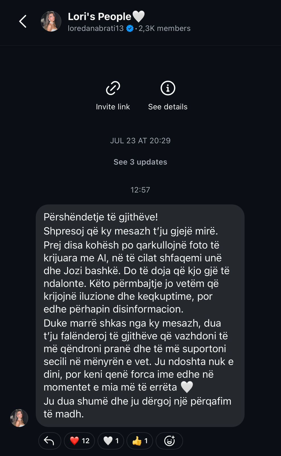 “Prej disa kohësh po qarkullojnë foto të krijuara me AI, në të cilat shfaqemi unë dhe Jozi bashkë. Do të doja që kjo gjë të ndalonte. Këto përmbajtje jo vetëm që krijojnë iluzione dhe keqkuptime, por edhe përhapin disinformacion”.