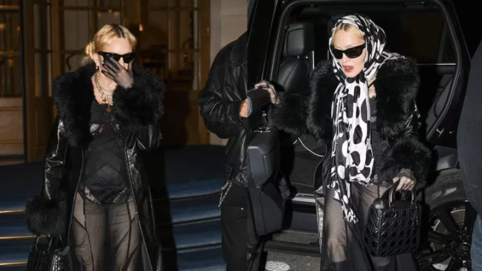Madonna mahnit me një fustan të tejdukshëm dhe një pallto të zezë, teksa del në Paris