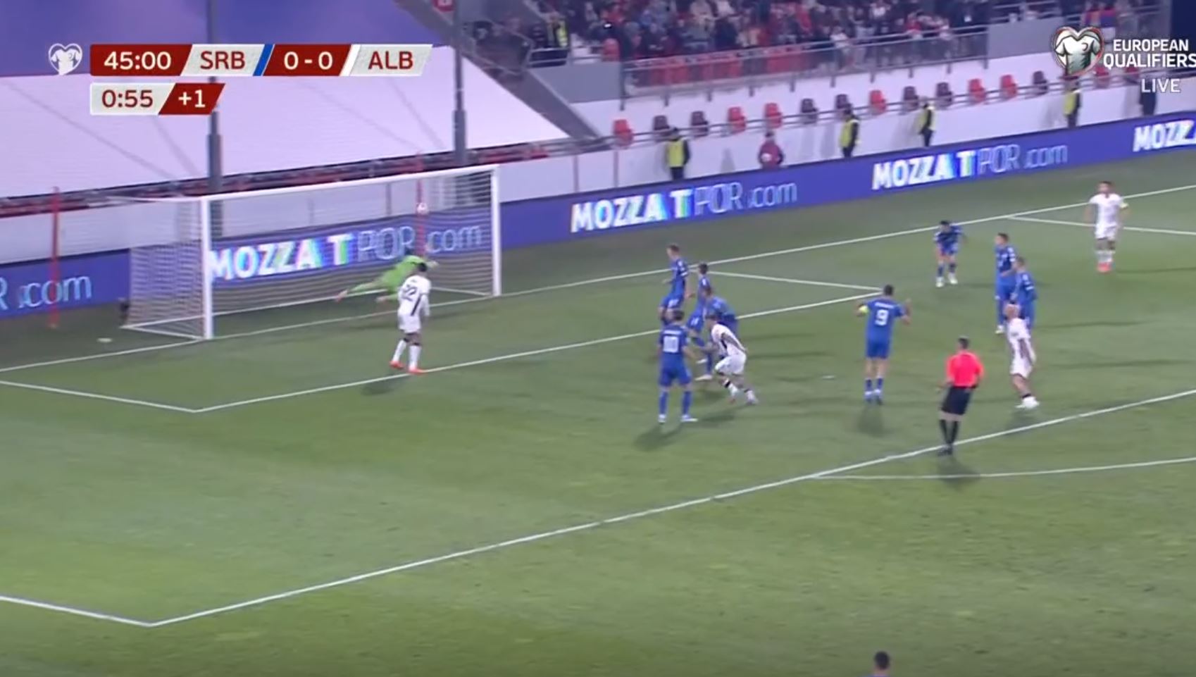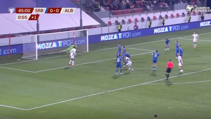 25’ Shqipëria e ka rrezikuar për herë të parë portën serbe në minutën e 23-të me anë të një goditje të lehtë të Uzunit, por që gjuajtja u prit nga portieri serb.