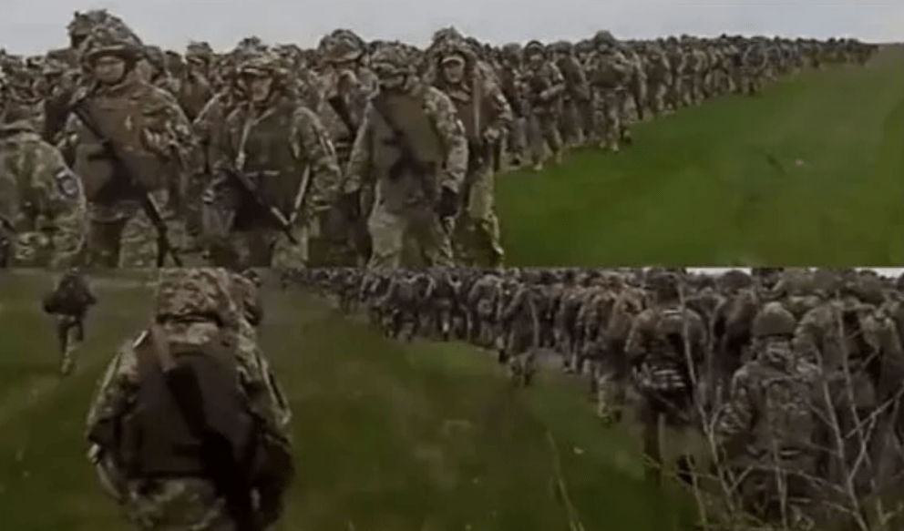 Në pamje radhë të gjata të mijëra ushtarëve që po marshonin në një fushë të hapur. Rusët po të përballen me drejtësi për krimet e tyre të luftës shkroi mediumi.