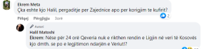 “Nëse për 24 orë Qeveria nuk e rikthen rendin e Ligjin në veri të Kosovës kjo dmth. se po e legjitimon ndarjen e Veriut!?”, ka shkruar ai duke iu përgjigjur një komentuesi.