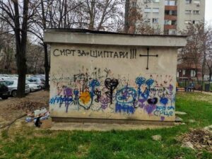 Thirrjet raciste dhe mbishkrimet kundër shqiptarëve vazhdojnë të jenë prezente nëpër shumë lokacione të kryeqytetit, shkruan gazeta LAJM. Një fotografi me një mbrishkrim të tillë ku kërkohet vdekja e shqiptarëve (SMRT ZA SIPTARI) është denoncuar në Facebook nga faqja “Zlostorstvo od Omraza” (krime nga urrejtja). Por, në këtë faqe është publikuar edhe një video ku shihet se si ky mbishkrim racist është mbuluar nga një grafit artistik me porosi pozitive që është vizatuar nga dy të rinjtë, Kamelija Kalamernikova dhe Pande Evtimov. Grafiti është vizatuar në lagjen Aerodrom të Shkupit, ku shumica dërmuese e banorëve janë maqedonas./Gazeta LAJM