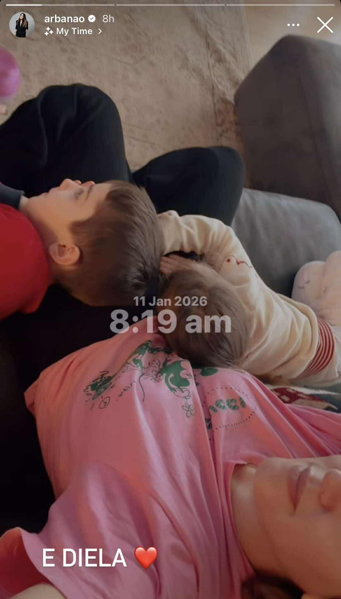 Në postimin e bërë në Instagram, Arbana shfaqet pranë fëmijëve të saj, të cilët i qëndrojnë në prehër. Pamjet pasqyrojnë një mëngjes të qetë dhe plot afeksion, shkruan “Kosovarja”.