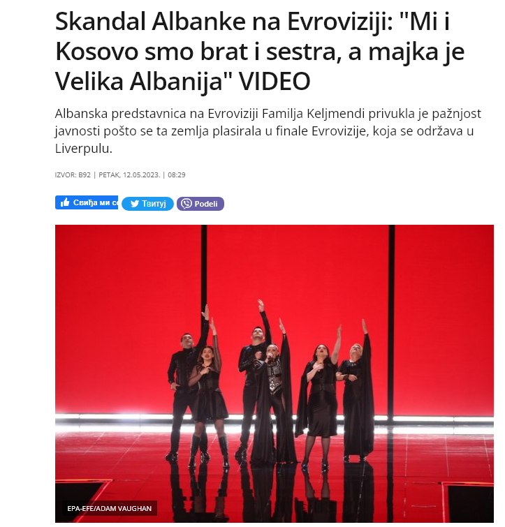 “Skandali i shqiptares në Eurovizion: “Shqipëria e Kosova jemi si vëlla e motër, dhe nëna jonë është Shqipëria e Madhe”, është vetëm një nga titujt e mediave në Serbi në lidhje me deklaratën e familjes Kelmendi para gazetarëve.