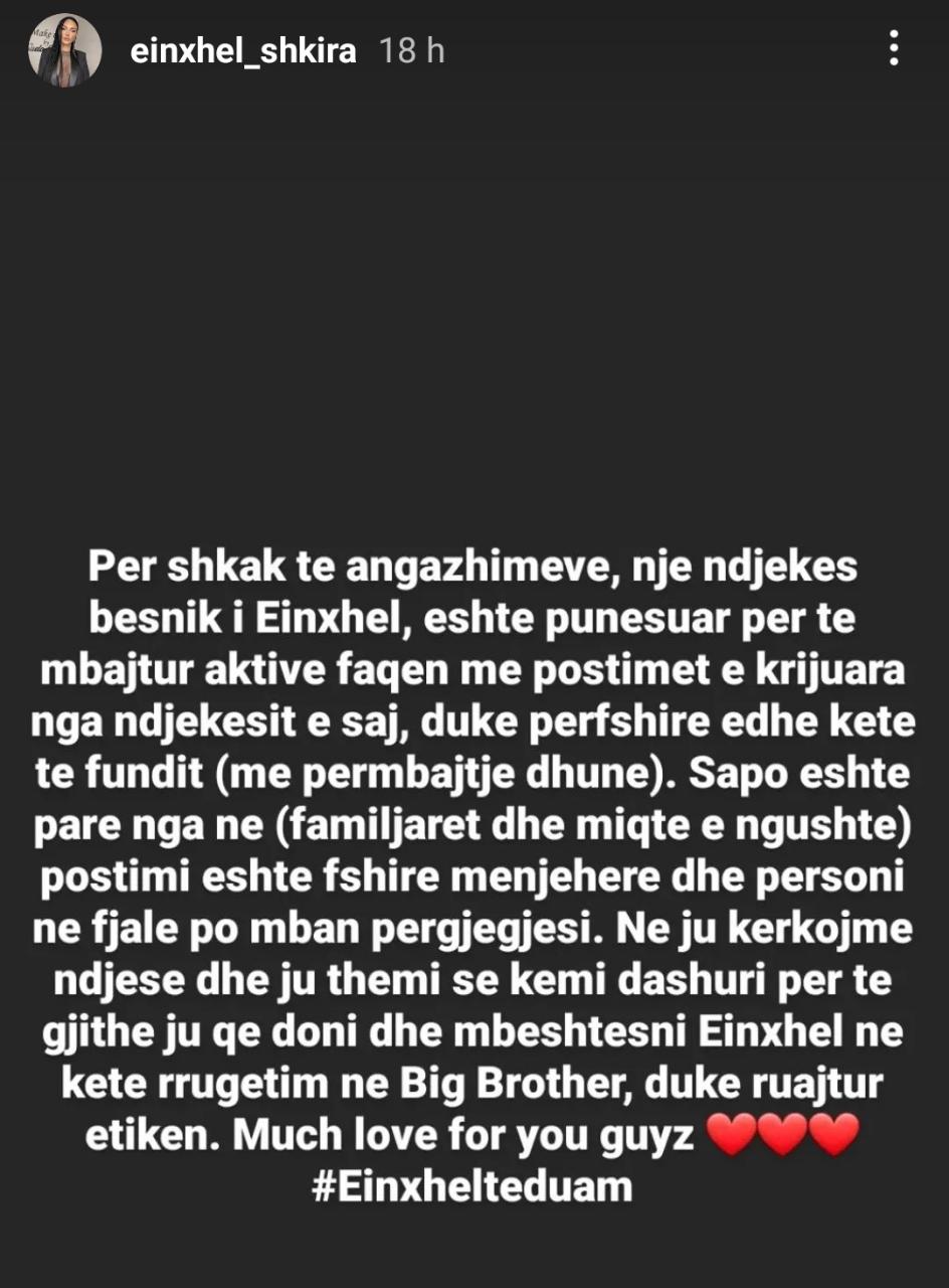 Mesa duket një fans i moderatores ka bërë një postim që nënkupton se ajo do t’ia dalë të nxjerrë nga shtëpia dy artistët. Postimi në “InstaStory” është fshirë më pas, dhe në një sqarim, familjarët e Einxhel kërkojnë ndjesë dhe shprehen se ka qenë veprim i një ndjekësi ishte angazhuar së fundi në postimet për moderatoren.