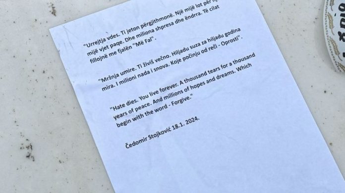 “Urrejtja vdes. Ti jeton përgjithmonë. Një mijë lot për një mijë vjet paqe. Dhe miliona shpresa dhe ëndrra. Të cilat fillojnë me fjalën ‘Më Fal’”, thuhet në letrën e lënë nga Stojkoviq në tri gjuhë, raporton Klan Kosova.