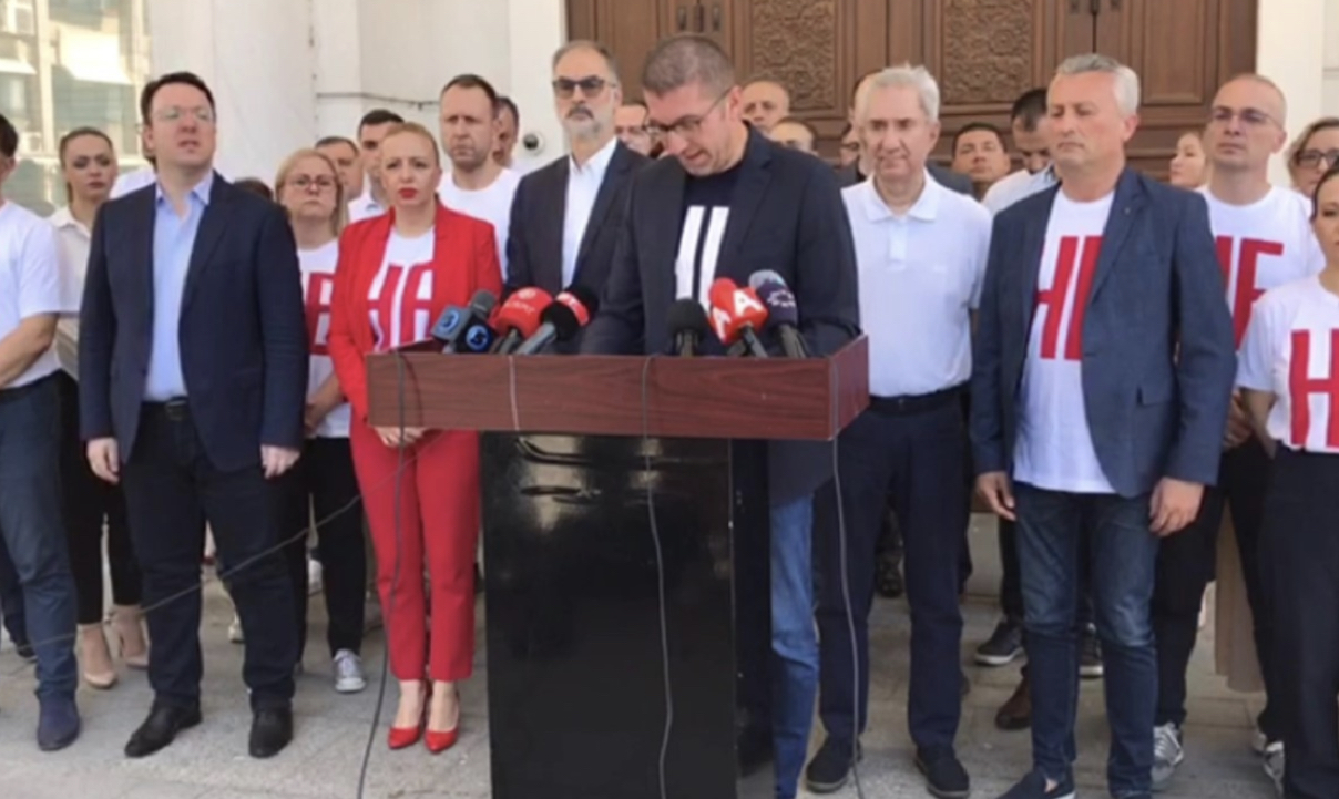 “Nismë e deputetëve si garanci me të cilën para qytetarëve obligohemi për këtë premtim tonin, me qëllim bllokim të tradhtisë të kësaj Qeverie, janë deklaratat e deputetëve të noterizuara, se me vetëdije të shëndoshë nuk do të pranojnë ndryshim të kushtetutës, e këtë e garantojnë me nderin e tyre, me vetëdijen dhe dorëheqjen e cila menjëherë hyn në fuqi nëse nuk ndodh kjo. Unë besoj se asnjë deputet nuk do ta miratojë këtë tradhti, e për këtë e keni fjalën time se kjo nuk do të ndodhë, këtu janë ato deklarata”, tha Mickoski.