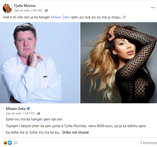 Së fundmi gazetari Milaim Zeka, ka publikuar një postim në Facebook ku, ironizoi me çantën 4000 euro të artistes Fjolla Morina, të cilën ja ka ngrënë qeni.