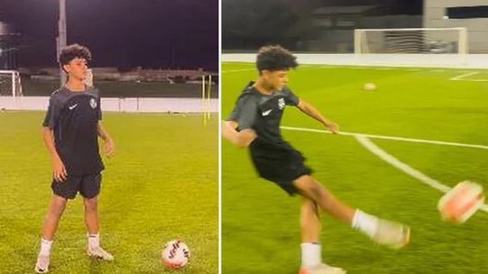 Cristiano Ronaldo Jr., djali i legjendarit portugez, ka mahnitur fansat e futbollit derisa realizon një goditje dënimi.