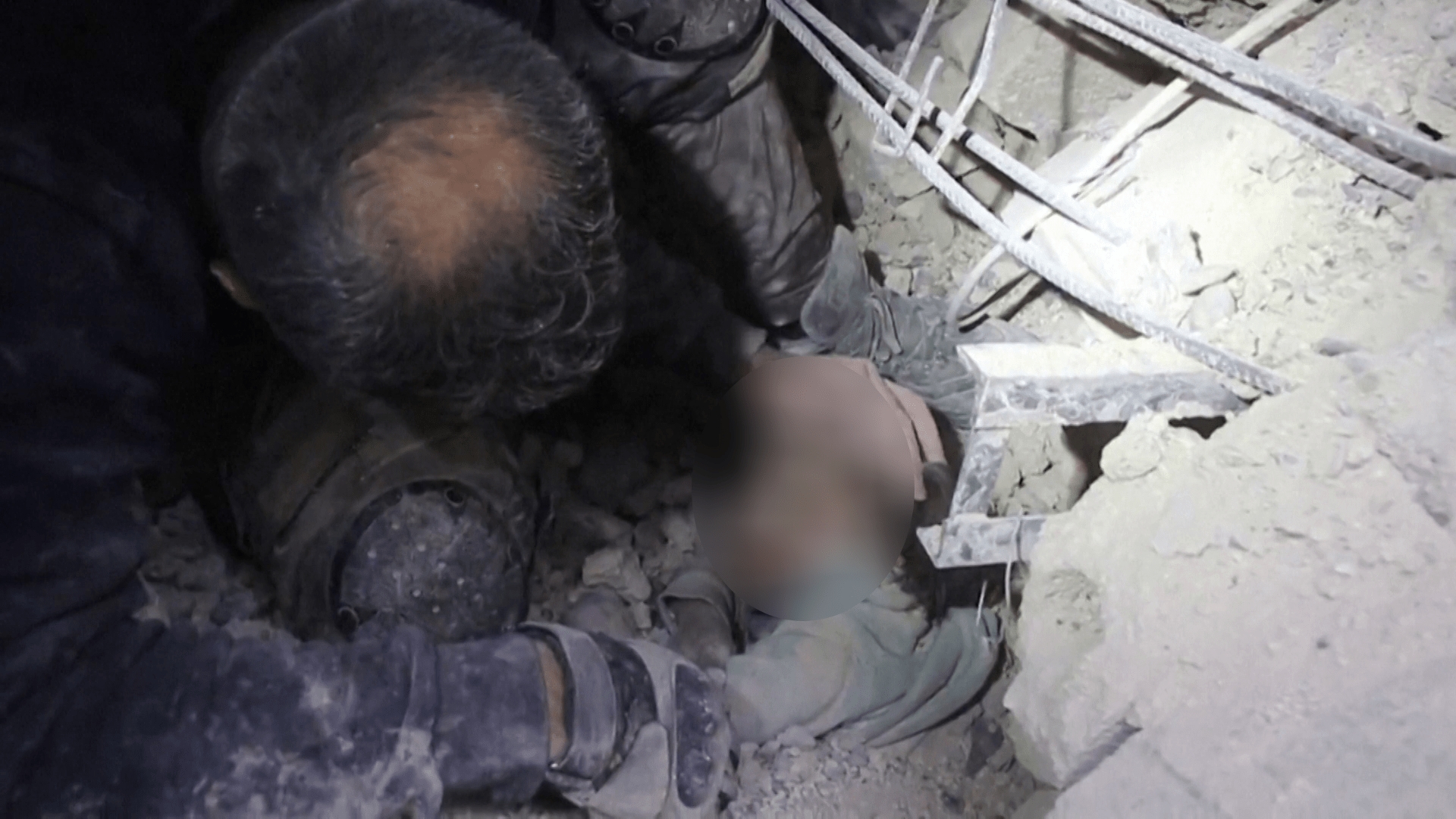 “Zoti është i madh”. Me këto fjalë, ekipet e shpëtimit në Siri nxjerrin të gjallë këtë vogëlushe nga rrënojat, në Jindires. Me një fytyrë qartësisht të tronditur, ajo është e mbuluar nga pluhuri, ndërsa trupin e ka të zhytur nën rrënojat e ndërtesës së shembur.