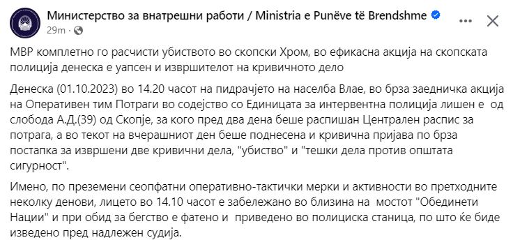 “Përkatësisht, pas ndërmarrjes së masave dhe aktiviteteve të gjithanshme operativo-taktike në ditët e kaluara, personi është pikasur në orën 14:10 afër urës “Kombet e Bashkuara”, dhe në momentin që ka tentuar të arratiset është kapur dhe ndaluar në stacion të policisë, pas çka do të sillet para organeve kompetente gjyqësore”, thonë mes tjerash nga MPB.