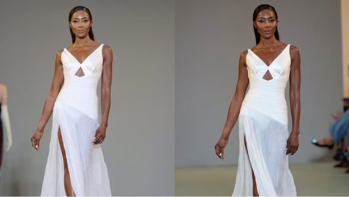 Naomi Campbell dukej e mrekullueshme teksa modeloi një fustan të bardhë në sfilatën e Del Core gjatë Javës së Modës në Milano të mërkurën.