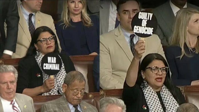 Përfaqësuesja Rashida Tlaib, anëtarja e vetme palestinezo-amerikane e Kongresit, mbajti një tabelë që etiketonte Netanyahun një “kriminel lufte” dhe “fajtor për gjenocid” gjatë fjalimit të tij, shkruajnë mediat e huaja.