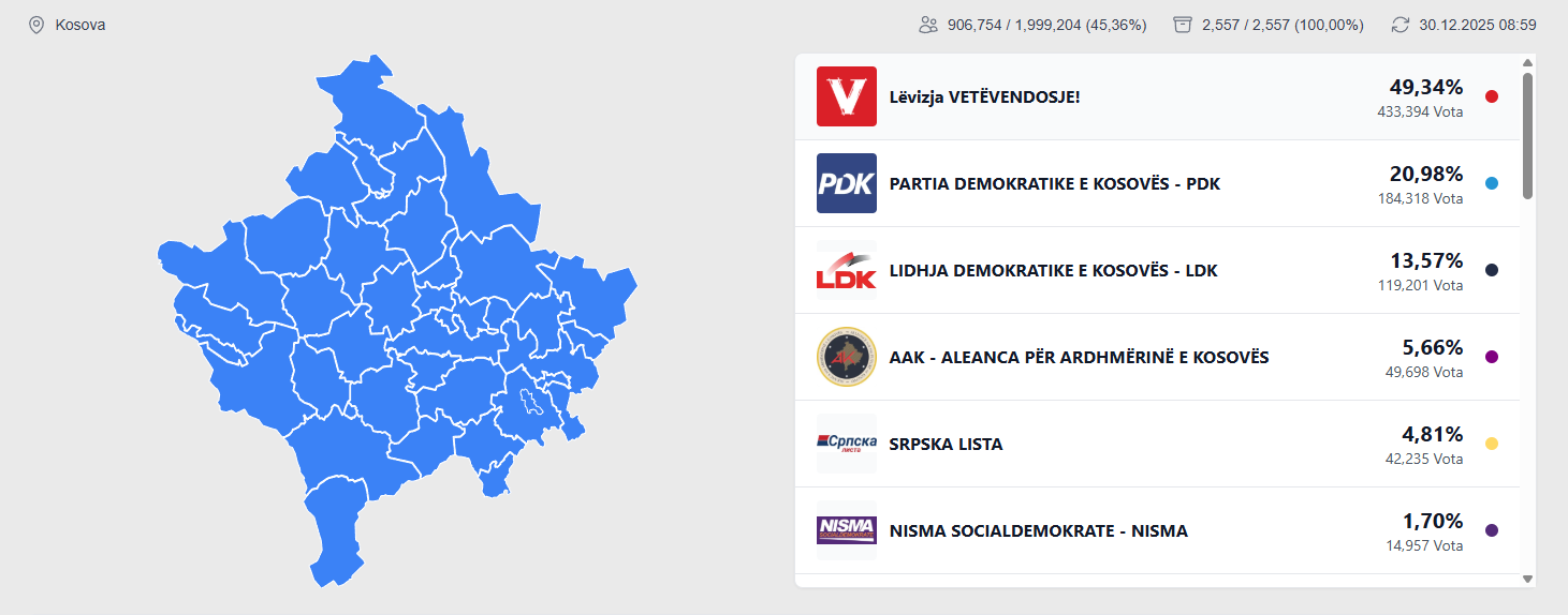 Komisioni Qendror i Zgjedhjeve ka procesuar 100 për qind të rezultateve preliminare të zgjedhjeve të jashtëzakonshme të 28 dhjetorit.Sipas rezultateve të publikuara nga KQZ-ja, fituese e zgjedhjeve të së dielës është Lëvizja Vetëvendosje me 433 mijë e 394 vota.