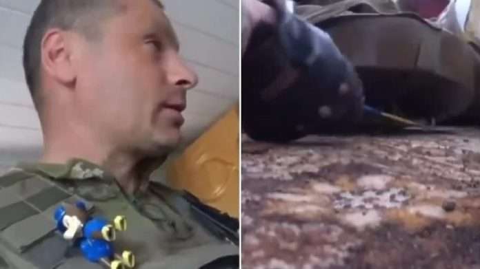 Një video e një oficeri ukrainas duke çmontuar një minë të vendosur duke përdorur një çekiç dhe mjete shtëpiake, u shfaq në rrjetet sociale.