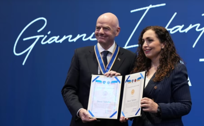 Presidentja e Kosovës, Vjosa Osmani e ka dekoruar të mërkurën presidentin e Federatës Botërore të Futbollit (FIFA), Gianni Infantino me medalje nderi për kontributin e tij në avancimin e rrugës së futbollistëve kosovarë në skenën ndërkombëtare.