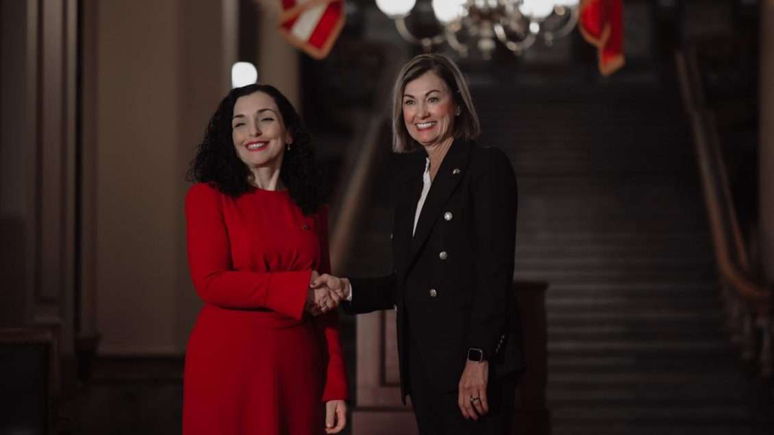 Presidentja e Kosovës, Vjosa Osmani, është pritur me ceremoni zyrtare nga Guverantorja e Iowa-s, Kim Reynolds.