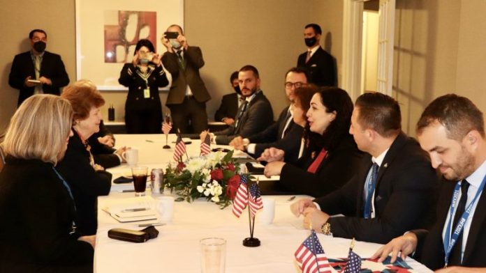 “Në këtë takim, Presidentja ka potencuar se diskursi nxitës nga Serbia është burim i destabilizimit në rajon, njësoj sikurse edhe tendencat ruse për shtrirjen e ndikimit negativ në rajon. Ajo theksoi se ky ndikim synon zhbërjen e arritjeve të SHBA-ve, BE-se dhe NATO-s në rajon lidhur me paqen, stabilitetin, demokracinë dhe sundimin e ligjit. Senatorët falënderuan Kosovën për pranimin e refugjatëve afganë dhe realizimin e misionit të parë paqësor jashtë vendit të ushtarëve të FSK-së përkrahë Ushtrisë Amerikane në Kuvajt, duke rikonfirmuar kështu partneritetin e fuqishëm ndërmjet Kosovës dhe Amerikës dhe kontributin për paqe e siguri në botë”, thuhet në njoftim.
