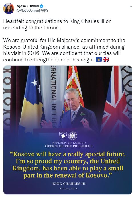 “Ne jemi mirënjohës për përkushtimin e Madhërisë së Tij ndaj aleancës Kosovë-Mbretërinë e Bashkuar, siç u konfirmua gjatë vizitës së tij në vitin 2016. Ne kemi besim se lidhjet tona do të vazhdojnë të forcohen nën sundimin e tij”, ka shkruar Osmani në Twitter.
