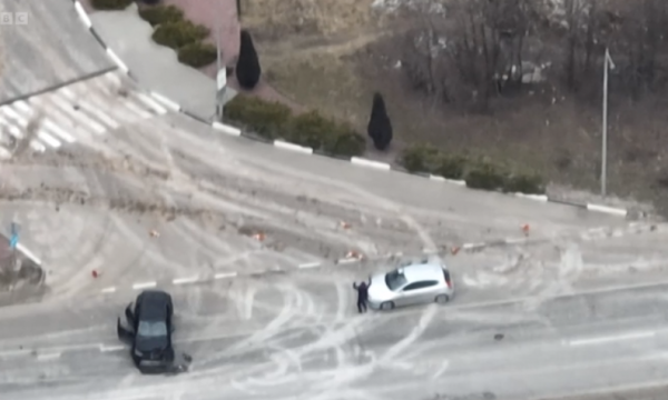 Një video e publikuar në BBC që u xhirua nga një dron shfaq një kolonë veturash që po iknin nga zona e luftës, pa e ditur se trupat ruse ishin pozicionuar përmbi ta.