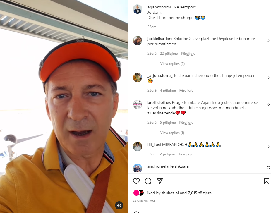 “Jam në aeroportin e Amanit, ka ardhur momenti për t’u kthyer në shtëpi. Mezi e kisha pritur këtë javën e fundit këtë moment, këtë javën e fundit që kam qëndruar 5 ditë në spital dhe pastaj në hotel në një gjendje të vështirë pas aksidentit që më ndodhi. Edhe që më detyroi të ndërpres udhëtimin që kisha ndërmend ta vazhdoja edhe në vend të tjera. Tani shpresoj që gjithçka të shkojë mirë, krahun e kam mirë dhe shpresoj që të mos kem probleme dhe komplikime gjatë fluturimit” u shpreh ai gjatë videos.