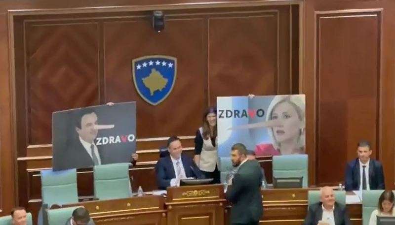 Deputetët e PDK-së, në seancën e kuvendit kanë vendosur pankarta në të cilat shihen kryeministri i vendit, Albin Kurti, e shefja e deputetëve të VV-së, Mimoza Kusari, me hunë të zgjatura e shprehjen serbe “zdravo”, përcjell Klankosova.tv.