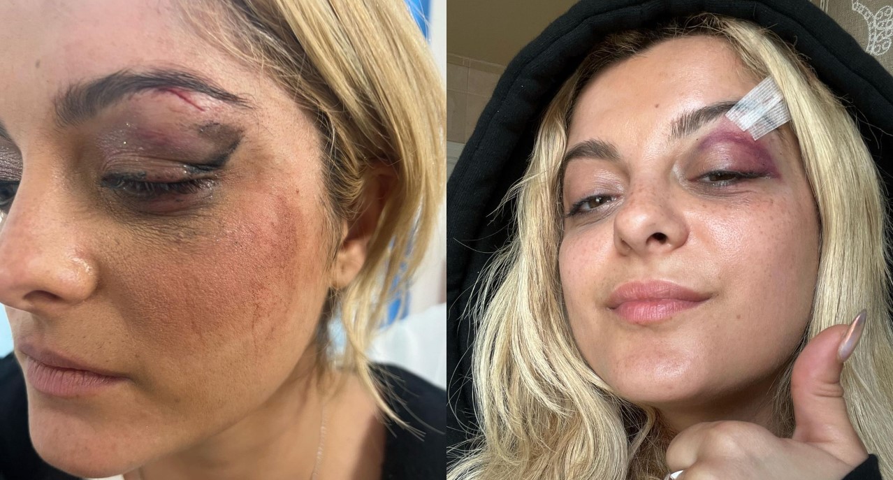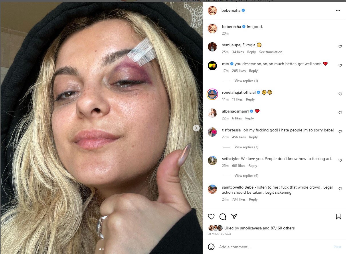 Ajo publikoi në llogarinë e saj zyrtare në Instagram dy fotografi, ku shihet me qepjet e bëra në fytyrë pas ndodhisë në koncert.