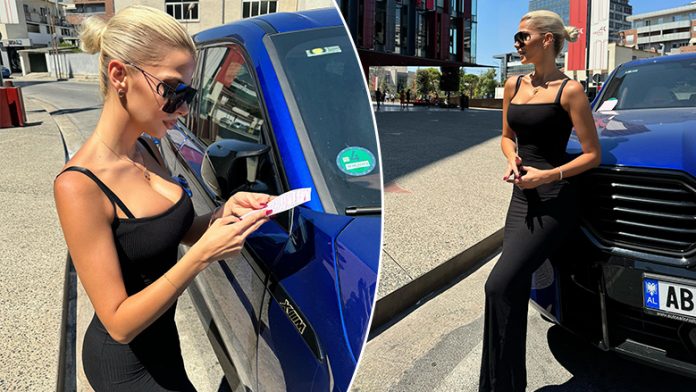 Ajo ka publikuar dy fotografi ku duket tejet atraktive, e veshur me një fustan të zi të gjatë, teksa shikon gjobën që ka marrë nga Policia e Shtetit.