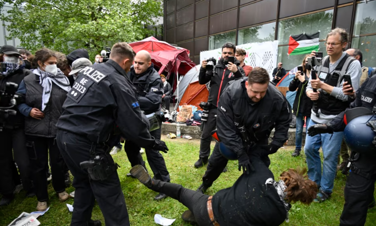 Më shumë se 25 automjete policore e rrethuan kampusin e Universitetit të Berlinit të martën, dhe Policia tha se e pastroi zonën me kërkesë të menaxhmentit të universitetit, pasi protesta nuk ishte regjistruar paraprakisht.