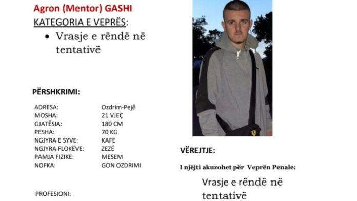 Policia e Kosovës ka kërkuar ndihmën e qytetarëve për arrestimin e Agron Mentor Gashit, i cili dyshohet për vrasje të rëndë në tentativë, që ndodhi të mërkurën në mbrëmje në Pejë.