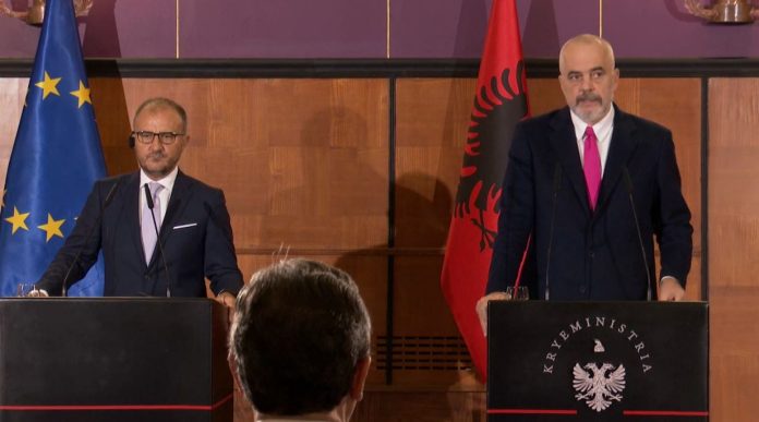 Kryeministri Edi Rama dhe ambasadori i Bashkimit Europian në Shqipëri, Luigi Soreca zhvillojnë një konferencë për median sot në Kryeministri për progres-raportin e KE-së.
